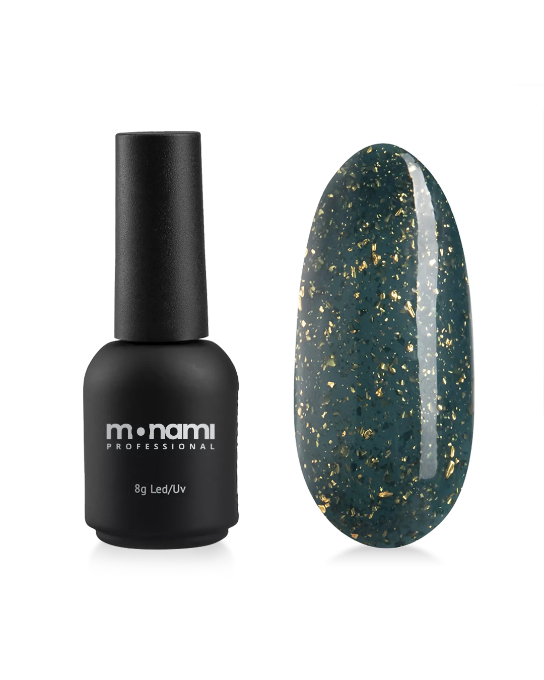 Гель-лак Monami на полупрозрачной основе c большим количеством бирюзовых блёсток разных размеров, средней консистенции.