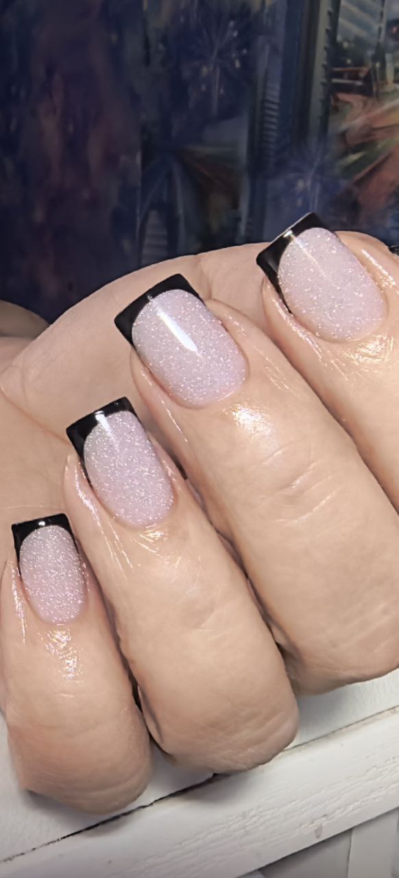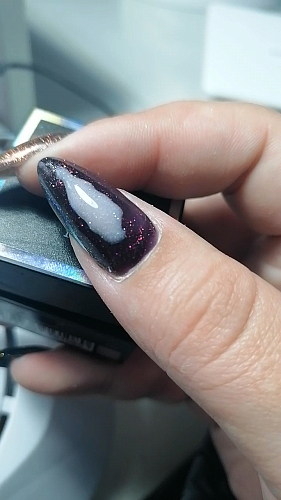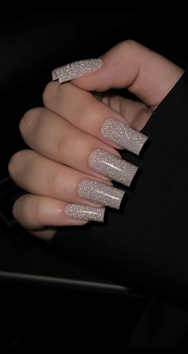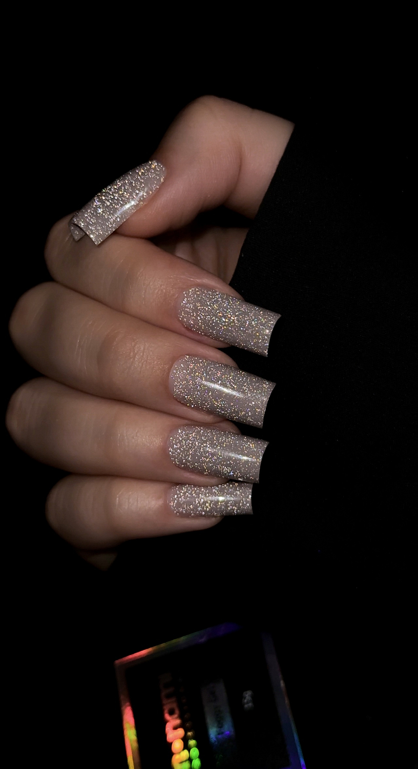- Мерцающие частицы равномерно распределяются по ногтевой пластине, не выступают наружу из покрытия и не требуют опила;