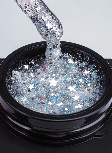 HOLLYWOOD Gel №1 - Ослепительный серебряный гель перенесет вас прямиком на "серебряную" киноленту. Он искрится, как тысячи вспышек папарацци, отражая свет софитов и заставляя руки сиять. Изысканный и смелый, он усыпан мириадами крошечных серебряных звездочек, создающих эффект драгоценного, жидкого металла, который притягивает взгляды и вызывает восхищение. Идеальный выбор для тех, кто готов быть в центре внимания.