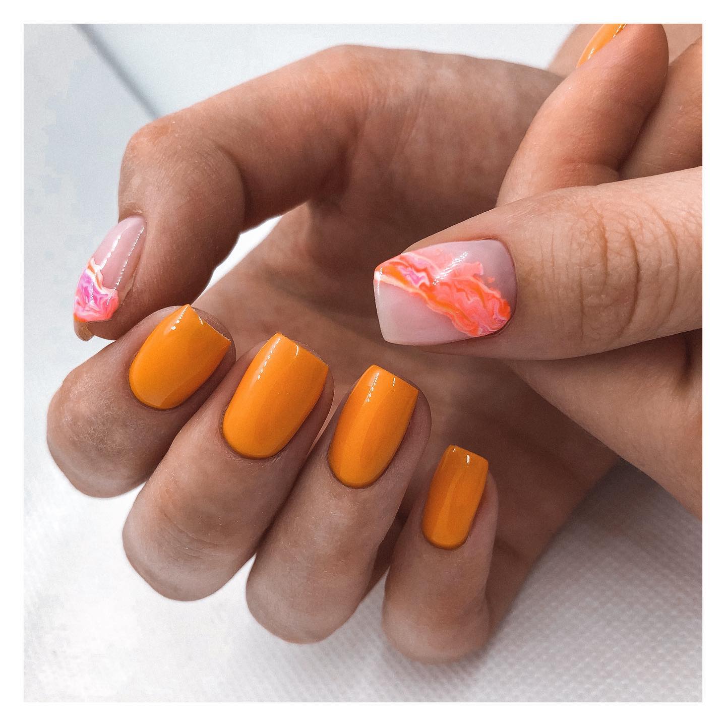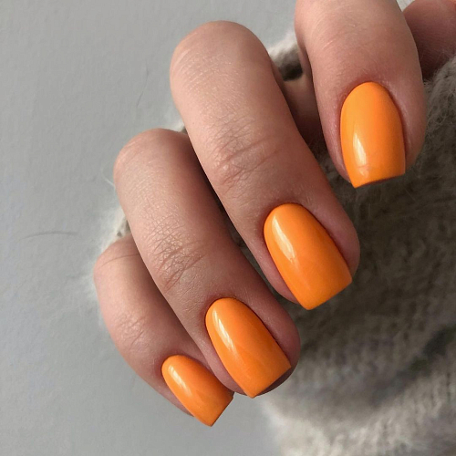 Гель-лак желто-оранжевый, без эффекта, плотный.