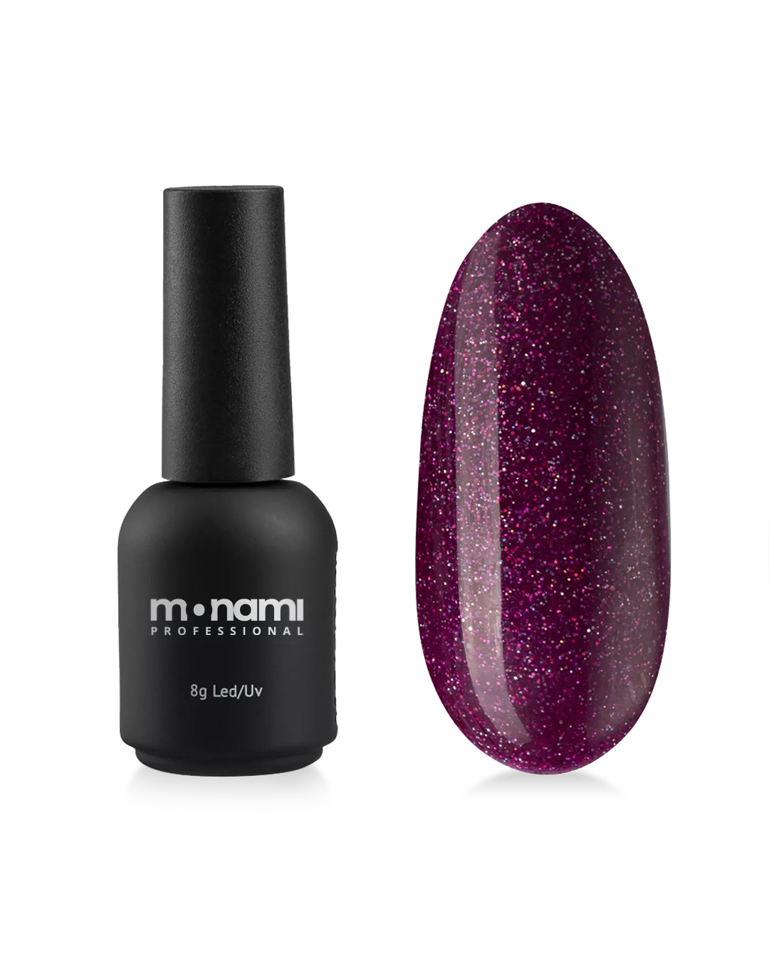 Гель-лак Monami в красно-пурпурном цвете, с блестками – это непревзойденное качество покрытия и стойкость вашего маникюра.