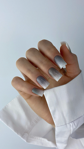 Гель-лак серо-голубого оттенка с блёстками и светоотражающими частицами.