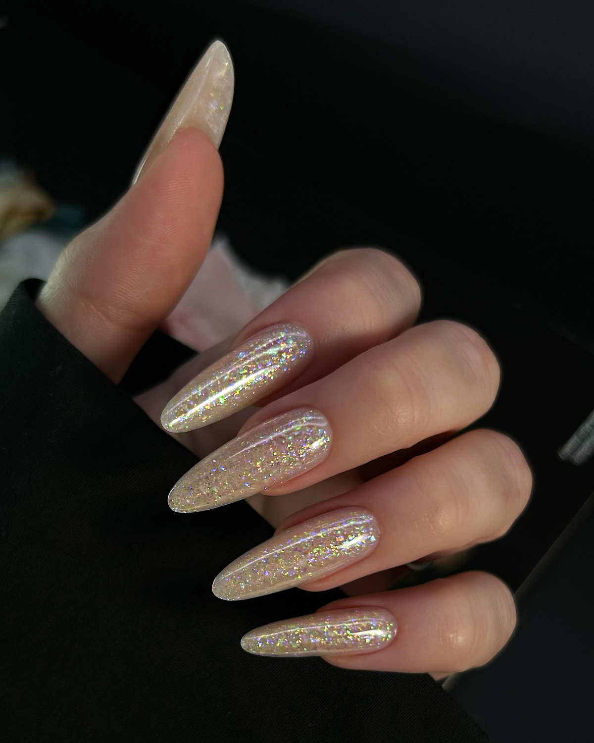 • Хлопья юки и светоотражающие частицы равномерно распределяются по ногтевой пластине;