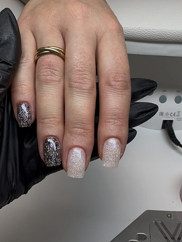 • Хлопья юки и светоотражающие частицы равномерно распределяются по ногтевой пластине;