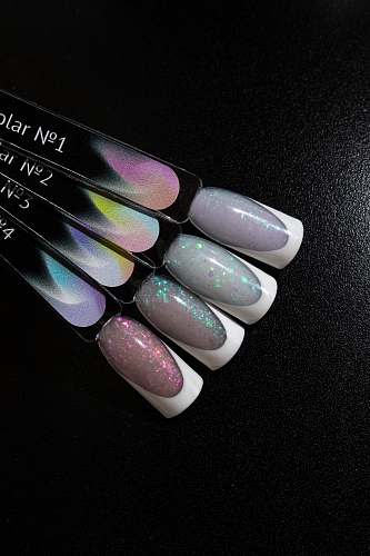 Коллекция жестких гелей с нежной цветной основой и частицами юки среднего помола. Источник вдохновения — северное сияние, и атмосфера безмятежности заполярного круга.