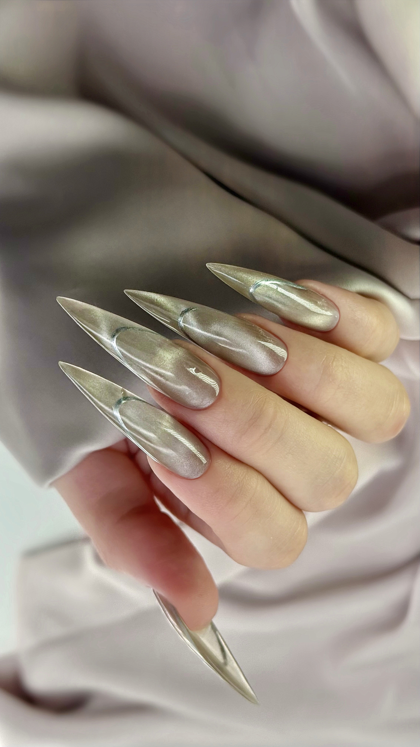 Гель-лак с бликами, переливы которых напоминают змеиную чешую.
