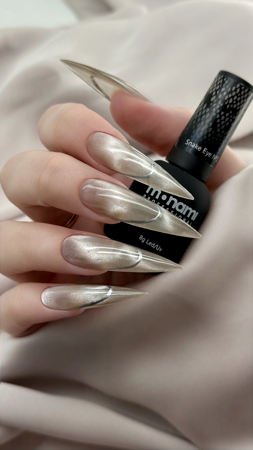 Новая коллекция гель-лаков Snake Eye от Monami Professional поможет сделать на ногтях неповторимый эффект змеиной чешуи! Эффектного, таинственного и манящего дизайна можно добиться с помощью магнита-трансформера и двустороннего магнита. Магниты позволяют создать разнообразные узоры, располагая магнитные частицы гель-лака в нужном направлении.
