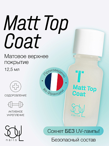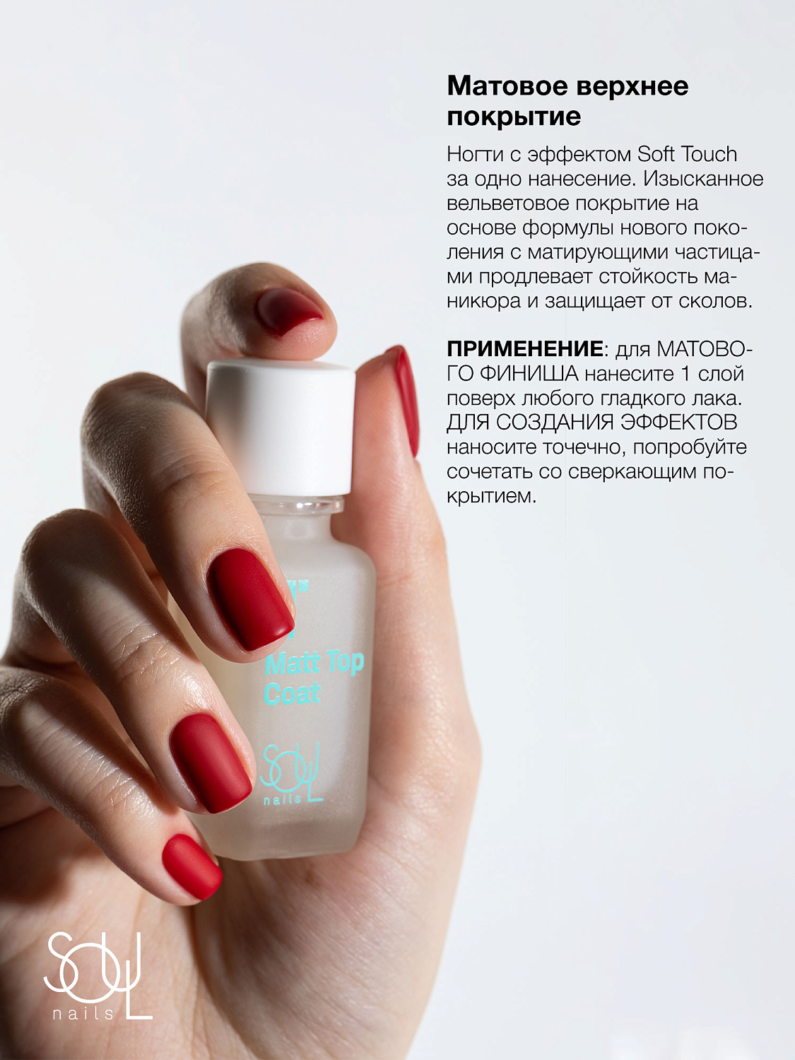 Матовое покрытие возможно воплотить без лампы на любой поверхности: база, цвет или чистая ногтевая пластина. Используя Matt Top Coat, вы получите ногти с бархатным эффектом Soft Touch, который хочется потрогать.