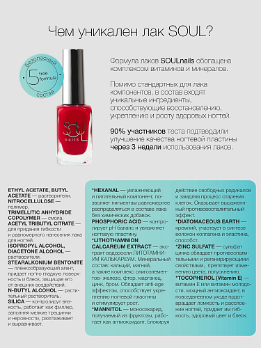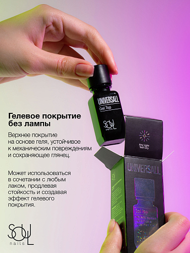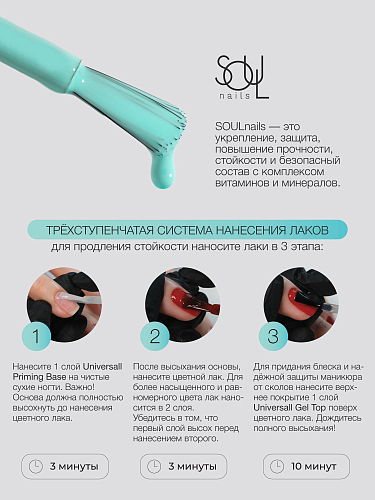 нанесите 1 слой поверх любого лака для продления стойкости или используйте 3-х ступенчатую систему с Universal Priming Base и любыми цветными лаками SOUL Nails