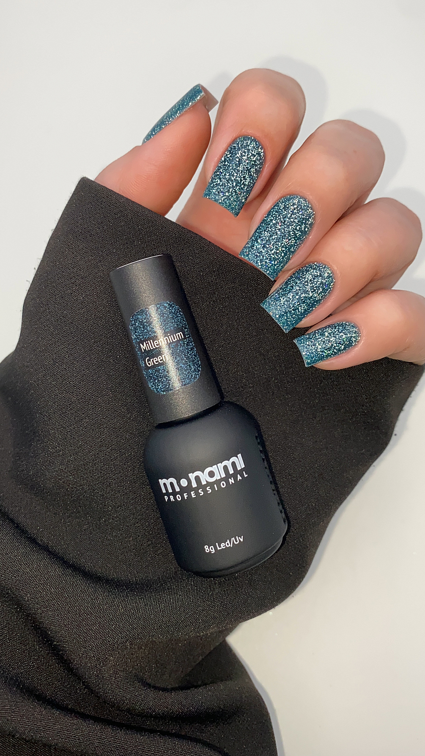 Гель-лак Monami со светоотражающими частицами в зеленом оттенке – это непревзойденное качество покрытия и стойкость вашего маникюра. Гель-лак сияет при попадании любого искусственного освещения на ногтевую пластину, а большое количество блесток позволяет сверкать вашему маникюр и при дневном освещении.