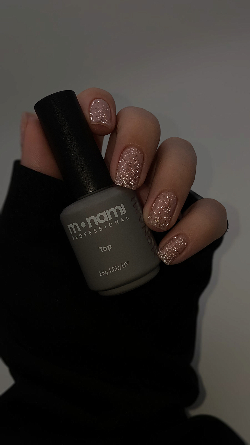 4.Нанесите верхнее покрытие Monami Super Shine top CRUSH, время полимеризации в LED (UV)-лампе – от 30 до 60 секунд.