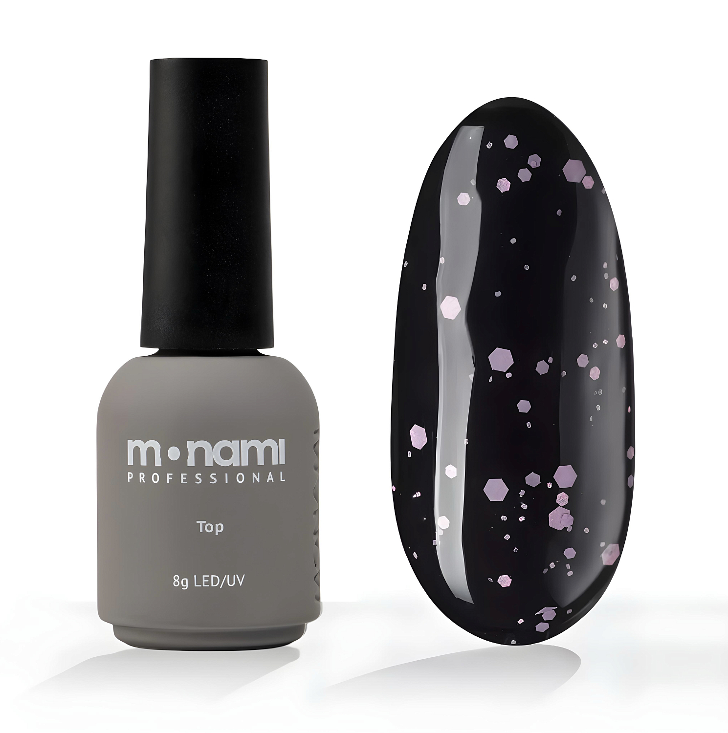 Топ без липкого слоя, средне-густой консистенции, с шестигранниками нежно-розового цвета — мягкие акценты в виде матовых блёсток.
