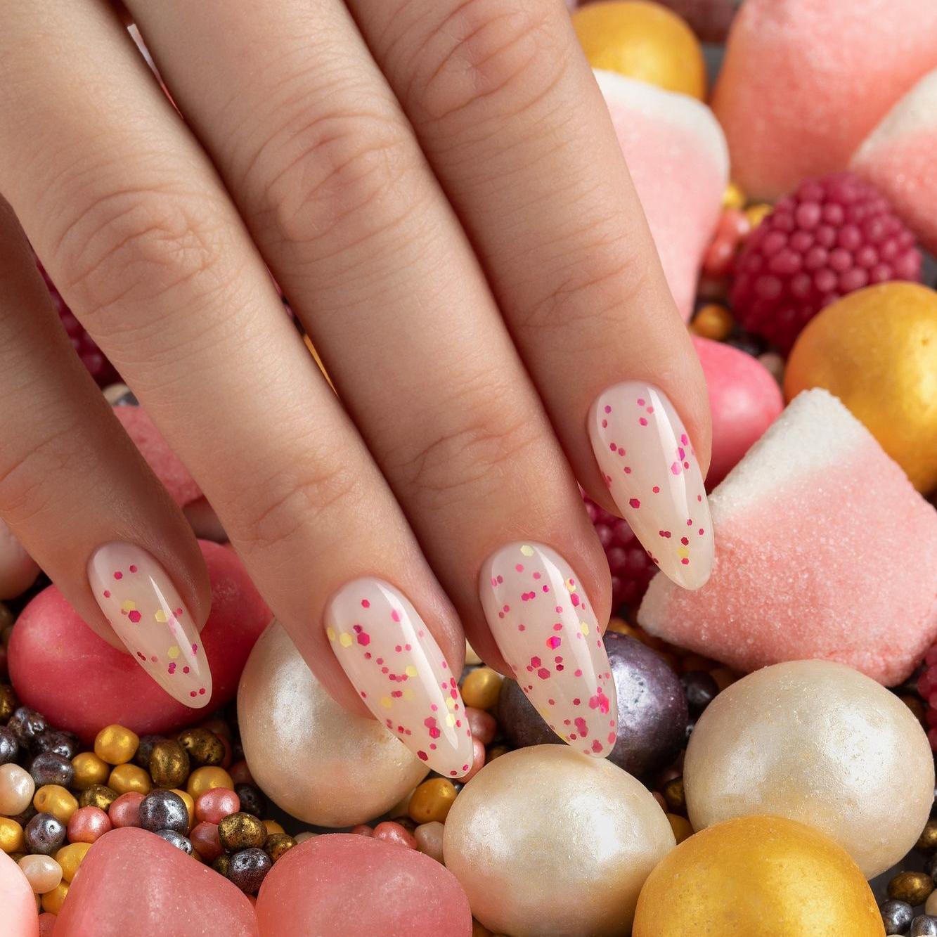 Цветное камуфлирующее базовое покрытие средней эластичности, средне-густой консистенции, с блёстками розового и жёлтого цвета.